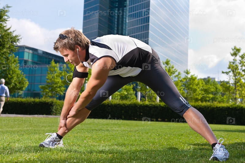 Городской спорт - парень разминается на лужайке
