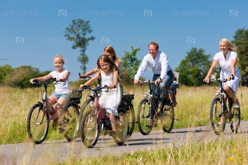 Семья с тремя детьми на велопрогулке в летний день