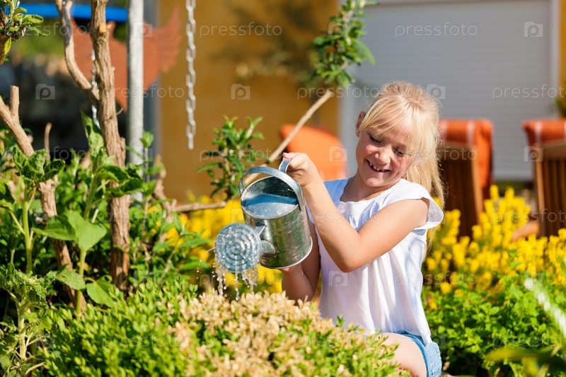 Счастливый ребенок поливает цветы в своем саду напротив дома