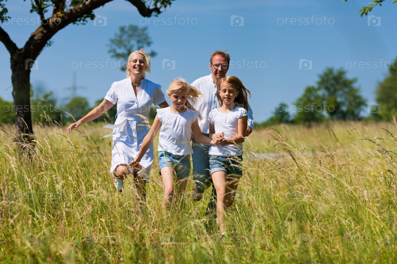 Счастливая семья с двумя девочками бежит на лугу летом
