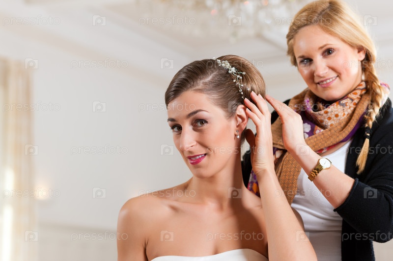 Стилист закрепляет прическу невесте перед свадьбой