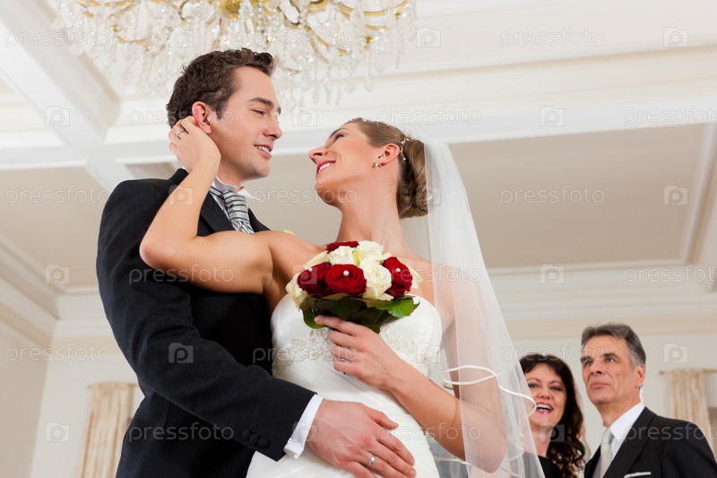 Молодожены в зале для церемонии и родители на заднем плане