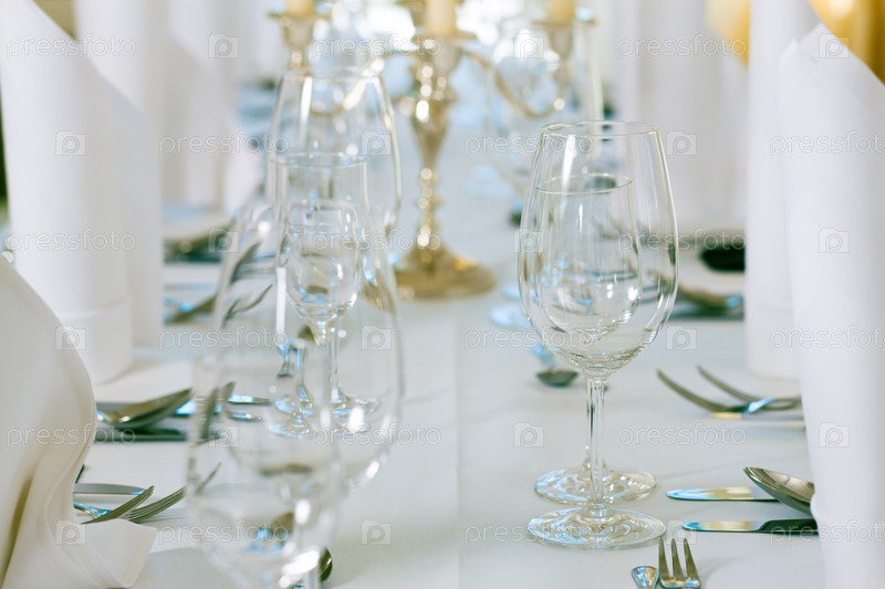 Свадебный стол с серебряными приборами и бокалами
