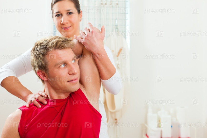 Пациент на процедуре физиотерапии делает упражнения с терапевтом