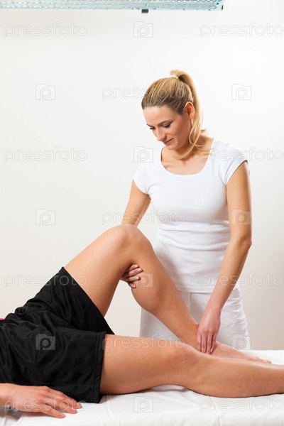 Пациент на процедуре физиотерапии делает упражнения с терапевтом