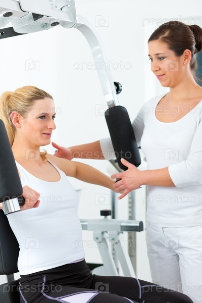 Пациент на процедуре физиотерапии делает упражнения с терапевтом