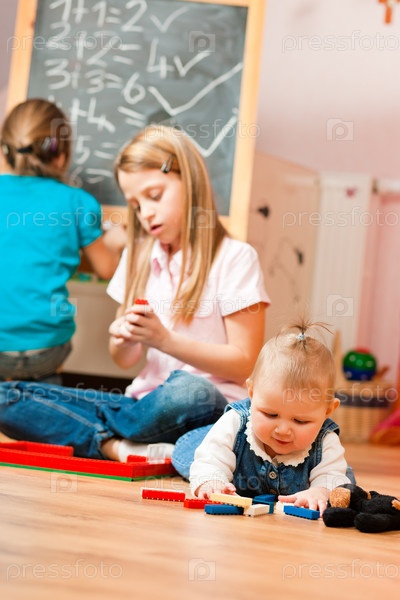 Сестры играют у себя дома, одна из них еще ползает