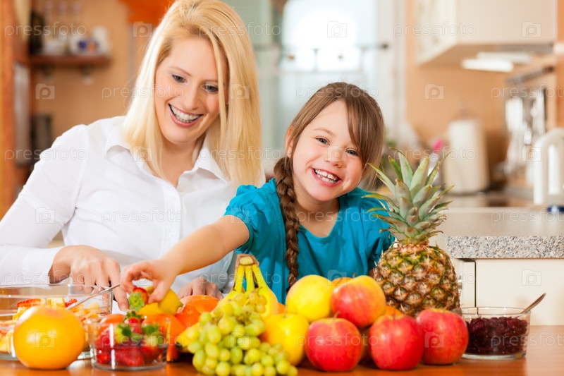 Мать и ребенок с большим количеством фруктов на завтрак