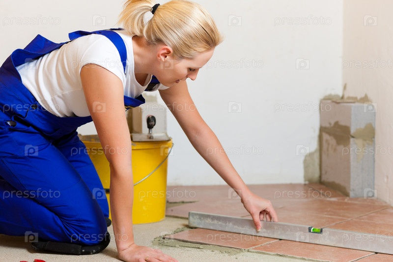 Женщины на стройке кладет плитку на пол