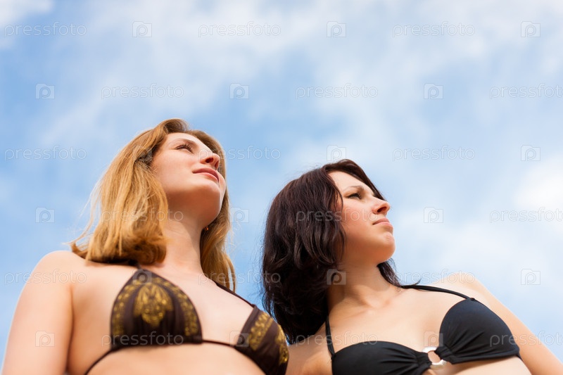 Две молодые женщины с голубым небом в летнее время