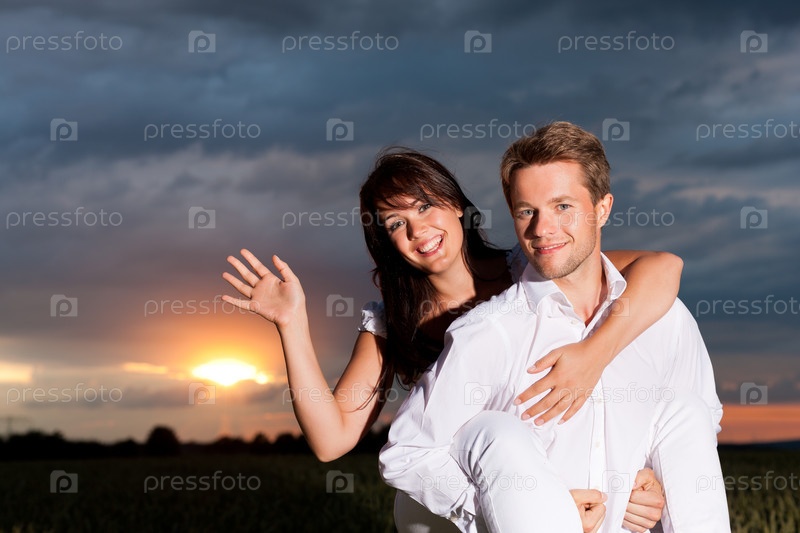 Молодая пара на фоне пасмурного неба летним вечером