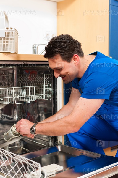 Техник ремонтирует посудомоечную машину