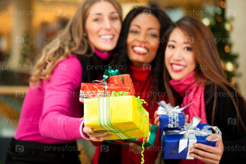Группа из трех женщин с рождественскими подарками