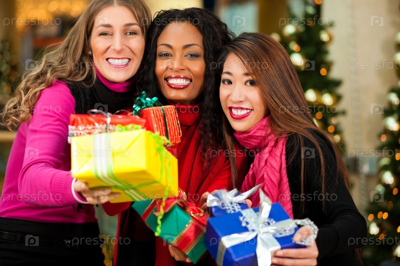 Группа из трех женщин с рождественскими подарками