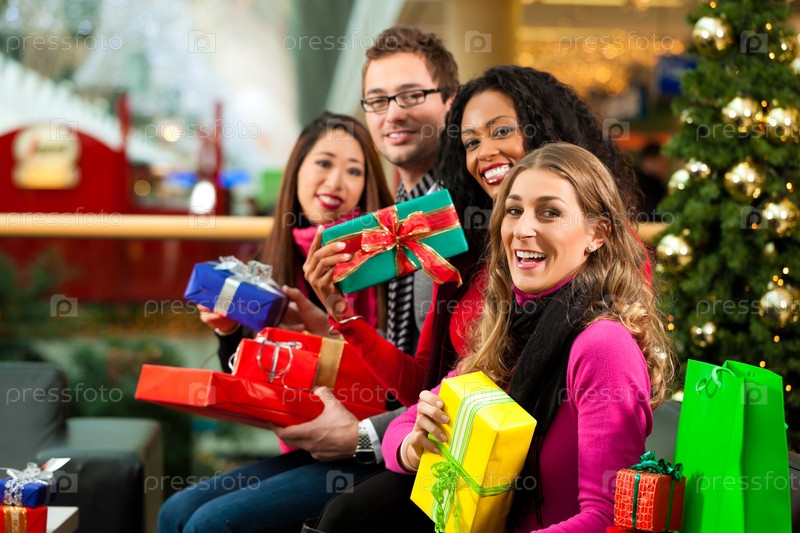 Группа из четырех человек с подарками возле елки