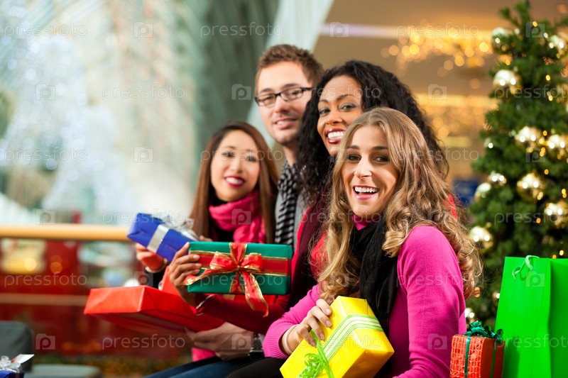 Группа из четырех человек с подарками возле елки
