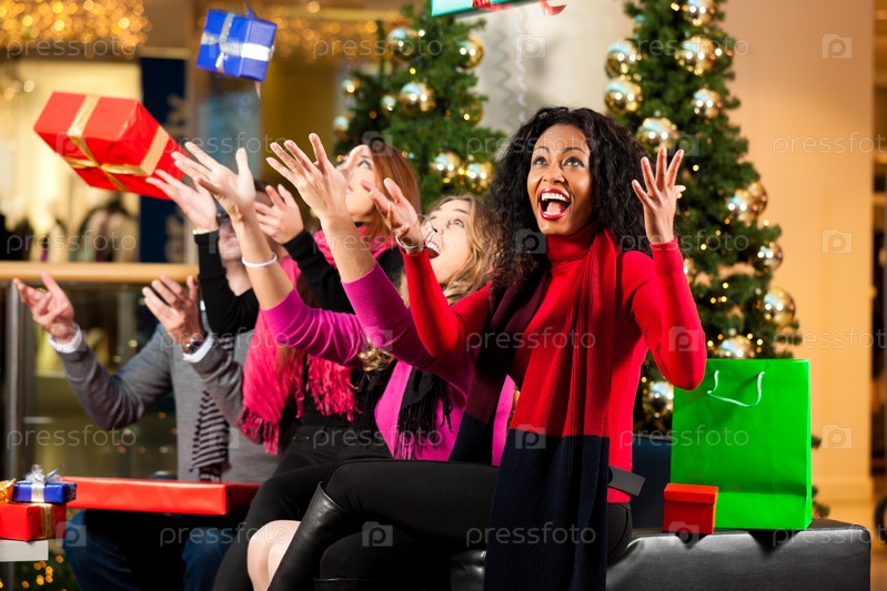 Разнообразие группа из четырех человек - кавказских, черный, так и Азии - сидя с рождественские подарки и сумки в торговом центре напротив елки с Фенечки