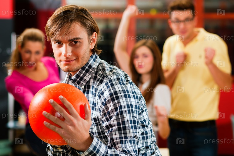Группа из четырех друзей в боулинге