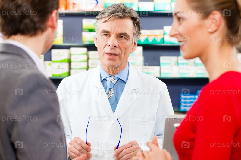 Фармацевт с клиентами в аптеке