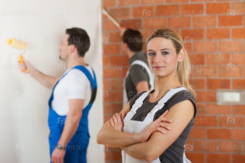 Женщина и двое мужчин ремонтируют квартиру