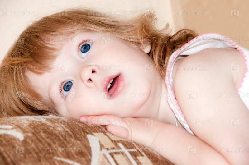 Хорошенькая голубоглазая девочка лежит на диване и смотрит в потолок
