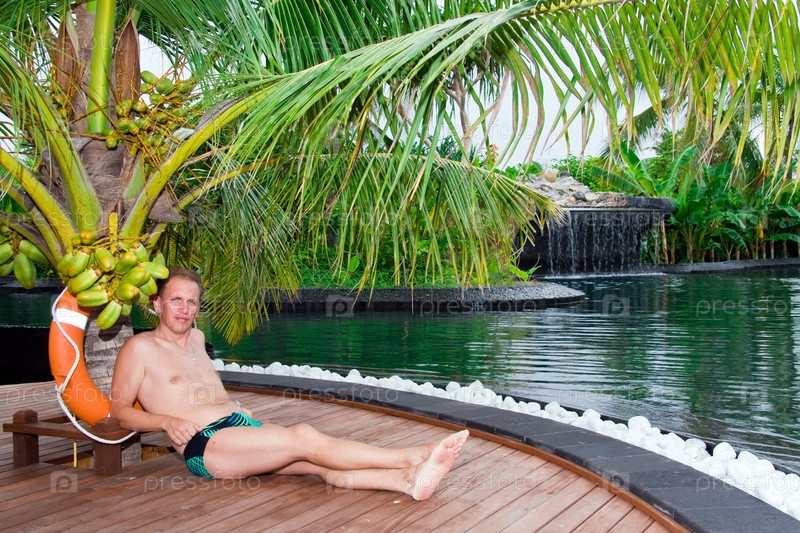Молодой спортивный мужчина под пальмой у бассейна