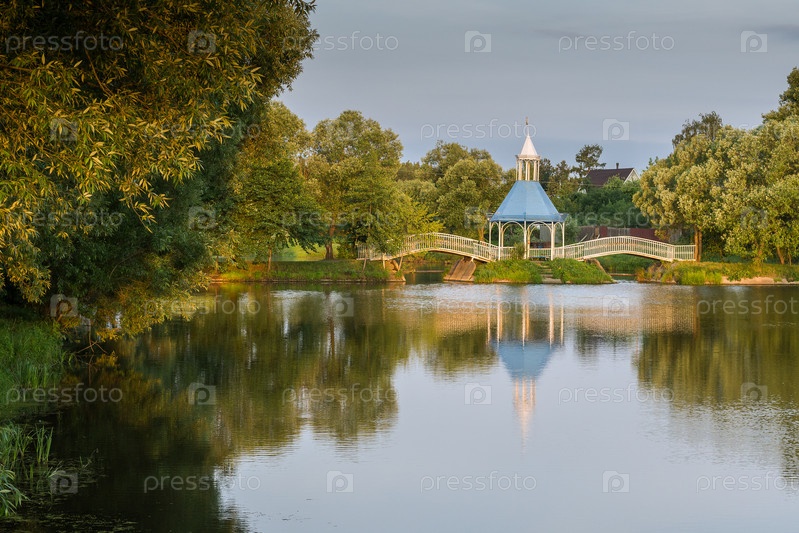 Живописный пейзаж с прудом и мостом на рассвете