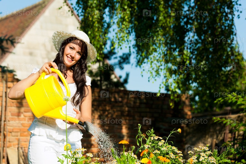 Садоводство женщина поливает из лейки в саду