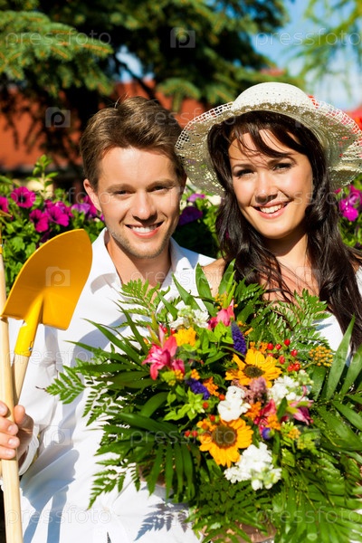 Счастливая пара в саду с букетом