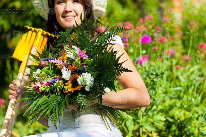 Женщина-садовник с инструментом в саду