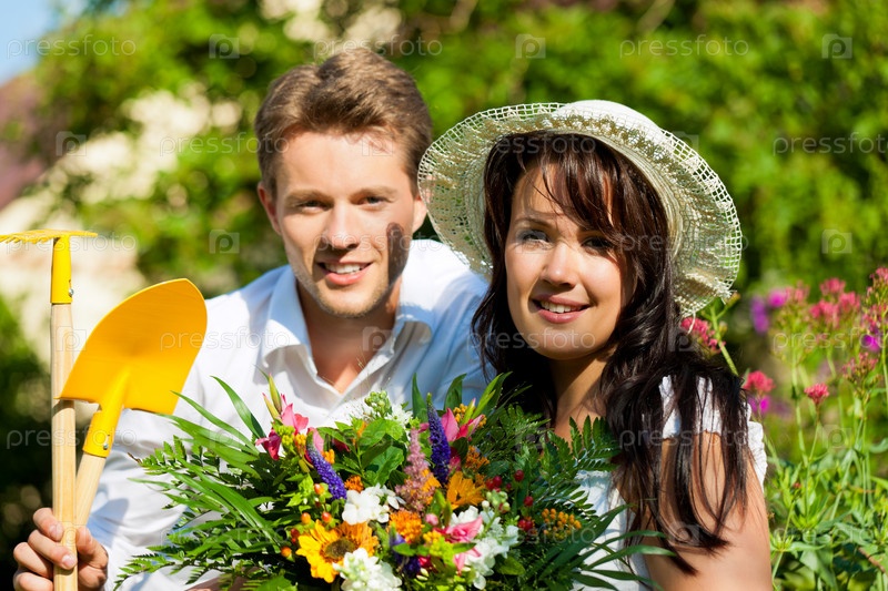 Счастливая пара в саду с букетом