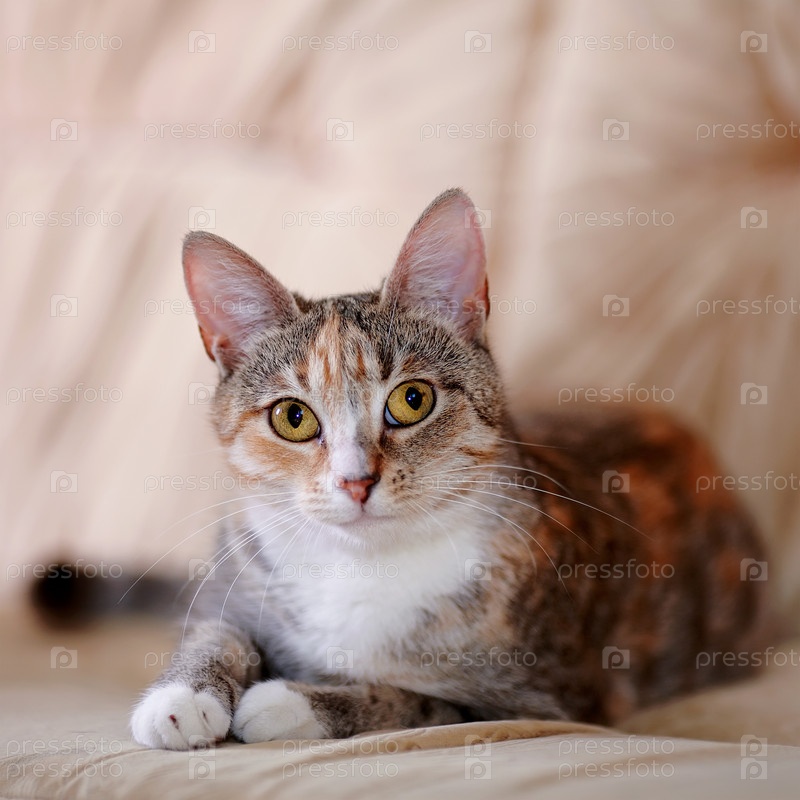 Кошка с желтыми глазами лежит на диване
