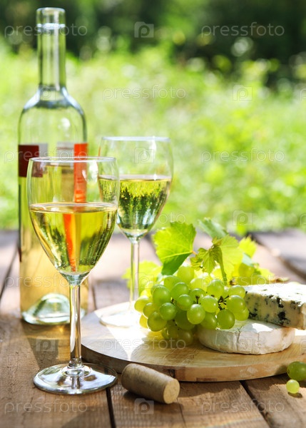 Сыр, виноград и два бокала белого вина