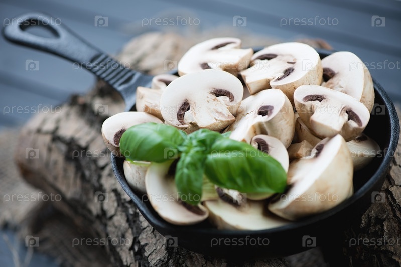 Сковорода с нарезанными шампиньонами и зеленым базиликом