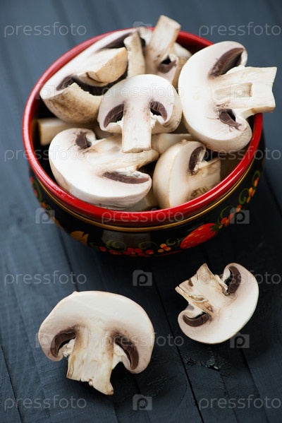 Хохломская миска с сырыми нарезанными шампиньонами на черной деревянной поверхности