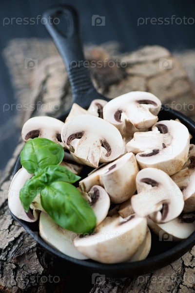 Сковорода с нарезанными шампиньонами и зеленым базиликом