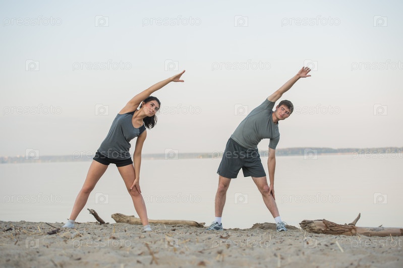Молодая пара делает растяжку