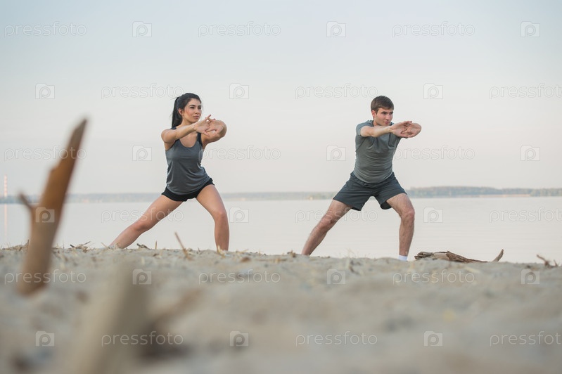 Молодая пара делает растяжку