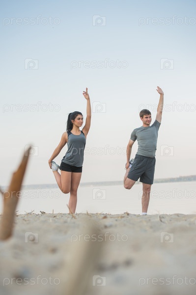 Молодая пара делает растяжку