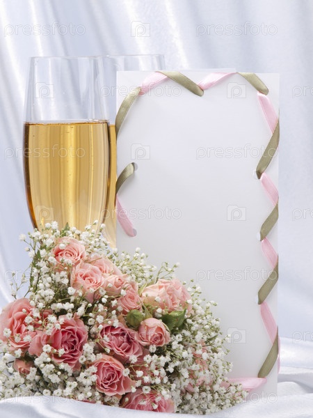 Бокал шампанского, букет невесты и открытка на белом шелке