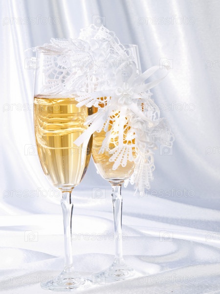 Два бокала с шампанским и свадебная подвязка на белом шелке