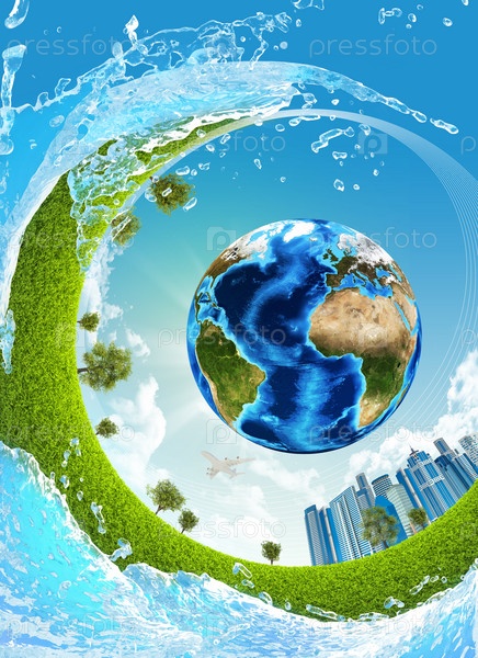 Земля, зеленая трава, небоскребы и вода