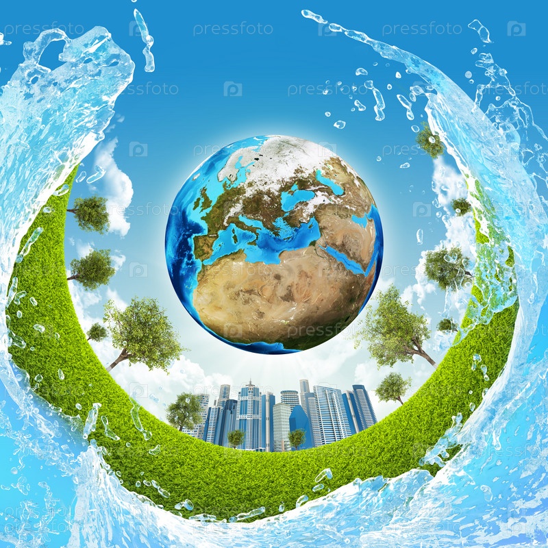 Земля, зеленая трава, небоскребы и вода