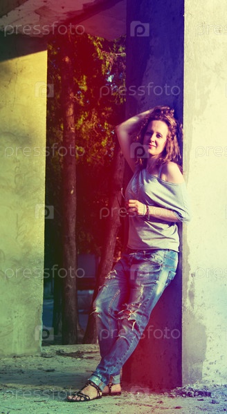 Девушка или женщина возле каменной стены