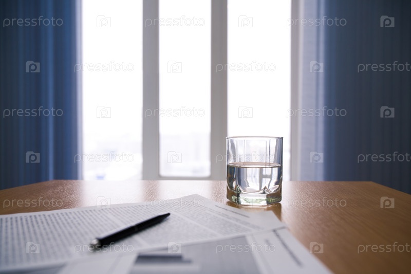 Изображение стакана воды на рабочем месте с бумагами и ручкой рядом