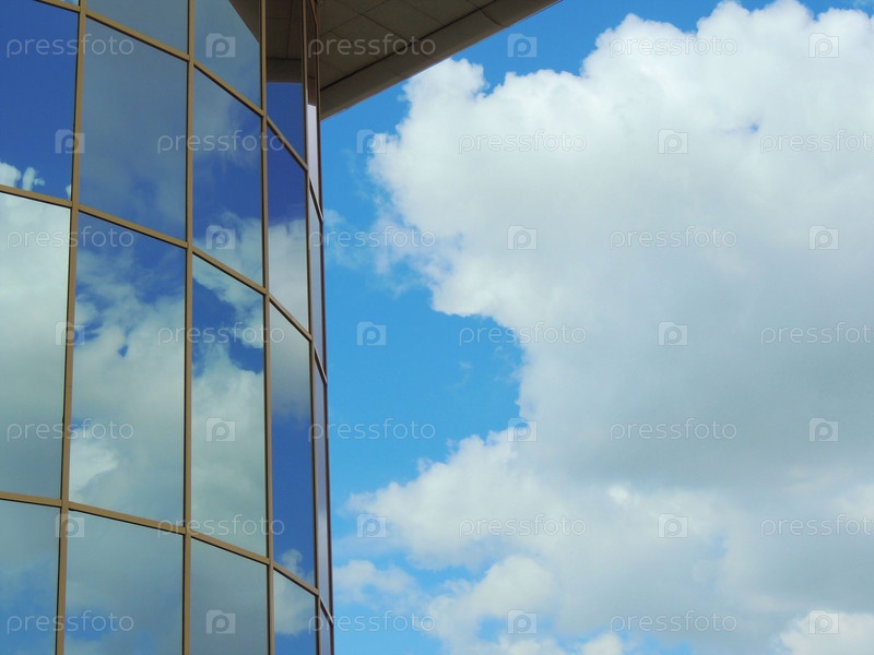Современное здание со стеклами отражающими небо с облаками. Городской пейзаж.