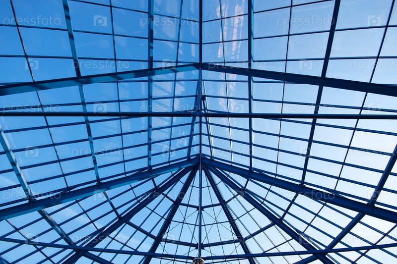 Голубое небо, вид сквозь стеклянную крышу современного здания