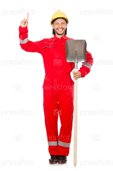 Мужчина в красном комбинезоне с лопатой