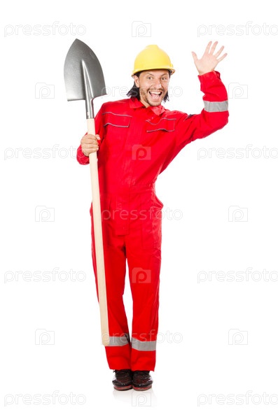 Мужчина в красном комбинезоне с лопатой