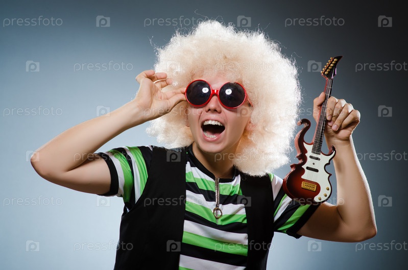 Забавный человек с миниатюрной гитарой